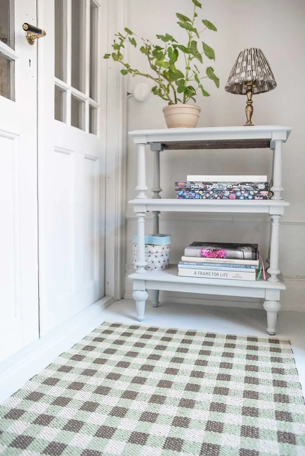 – Durable plastic mat with stylish checked pattern.