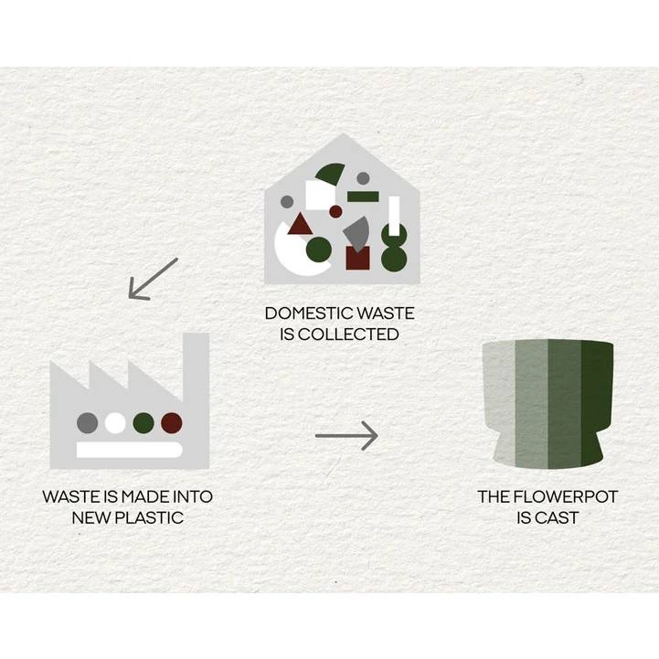 The pot by Rosendahl has a sustainable design in recycled, frostproof plastic perfect for both indoor and outdoor use. It has a rustic appearance with an uneven surface and a nature inspired, dark green colour. It has a light weight to easily move around at home.