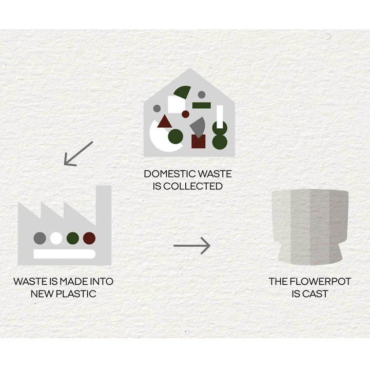 The pot by Rosendahl has a sustainable design in recycled, frostproof plastic perfect for both indoor and outdoor use. It has a rustic appearance with an uneven surface and a nature inspired, sand coloured shade. It has a light weight to easily move around at home.